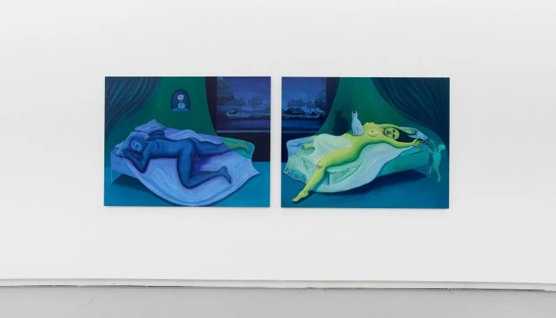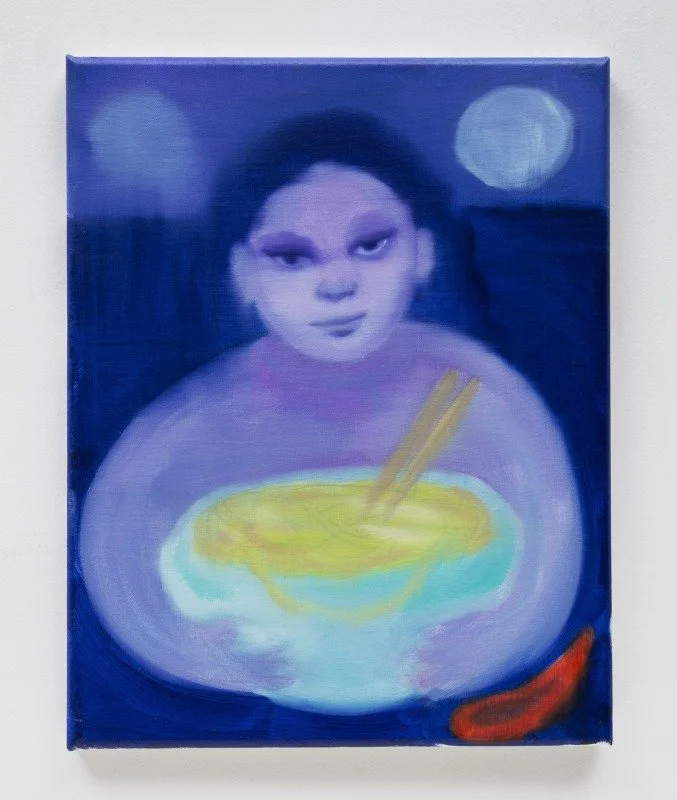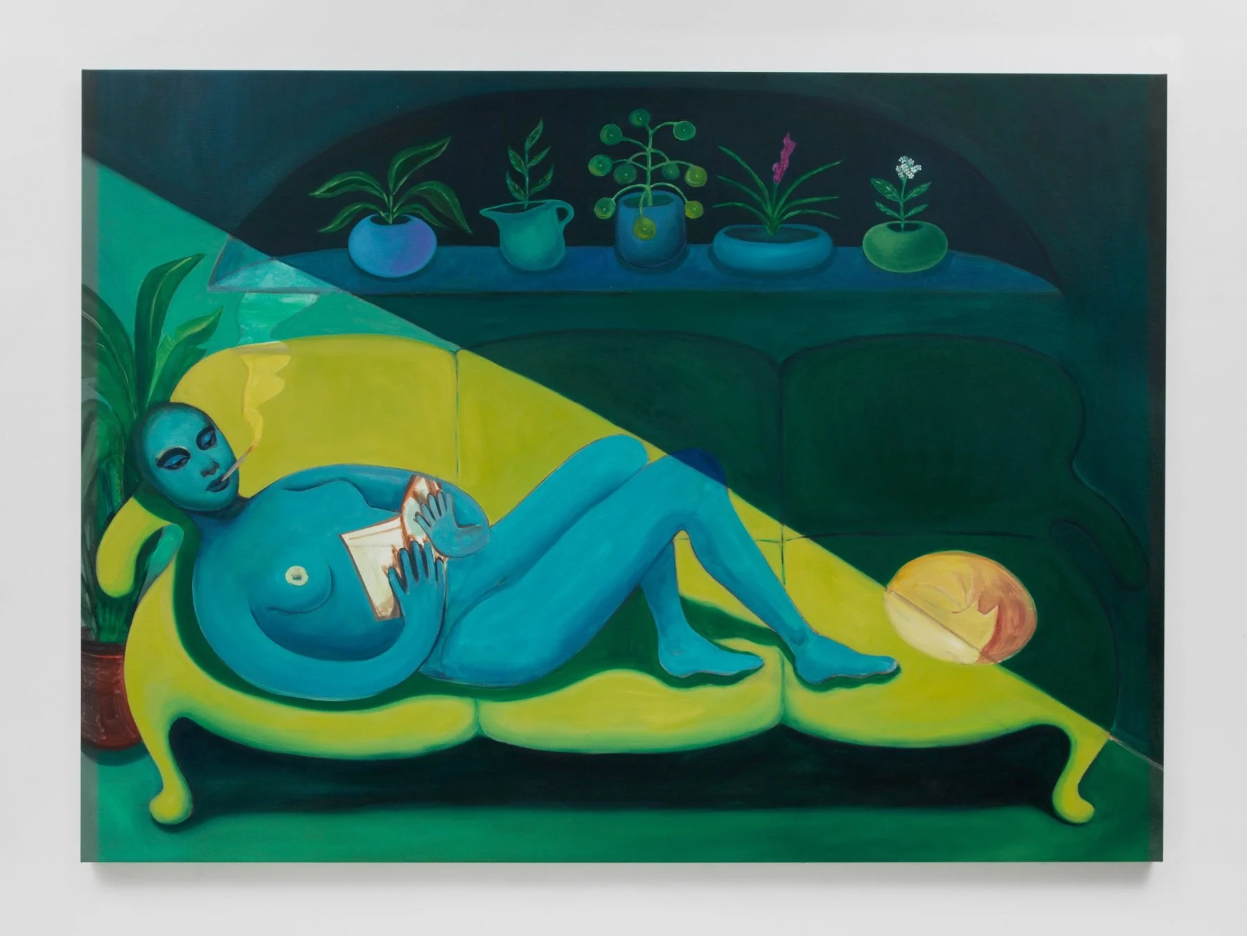In the best possible way, there is something deeply unsettling about Bambou Gili’s (born USA, 1996) paintings. As I walked into the Arsenal Contemporary gallery, I was reminded of the scene from Hitchcock’s classic movie, Vertigo, when Kim Novak is illuminated by light coming in from the window, bathing her in a sinister green glow.