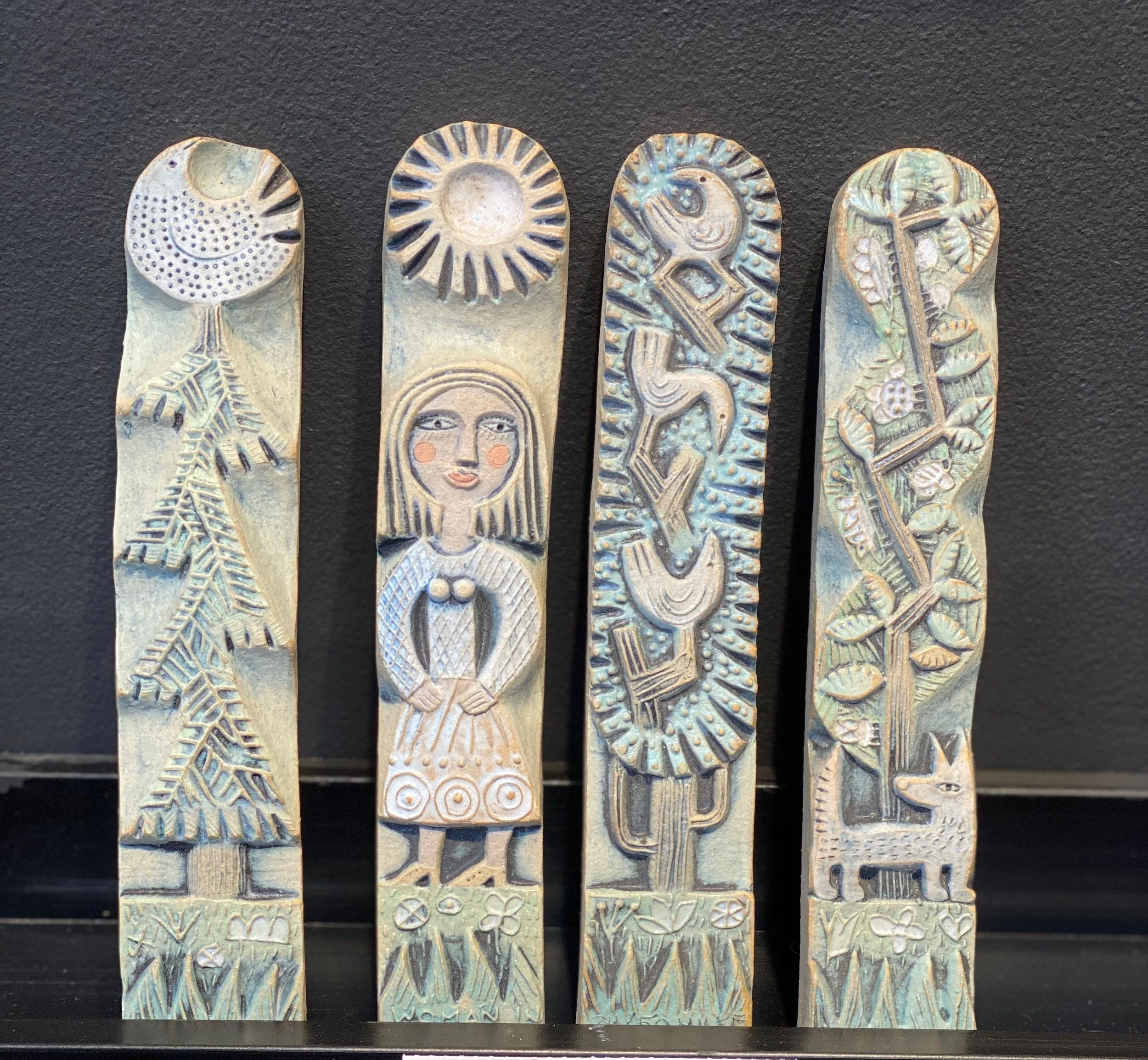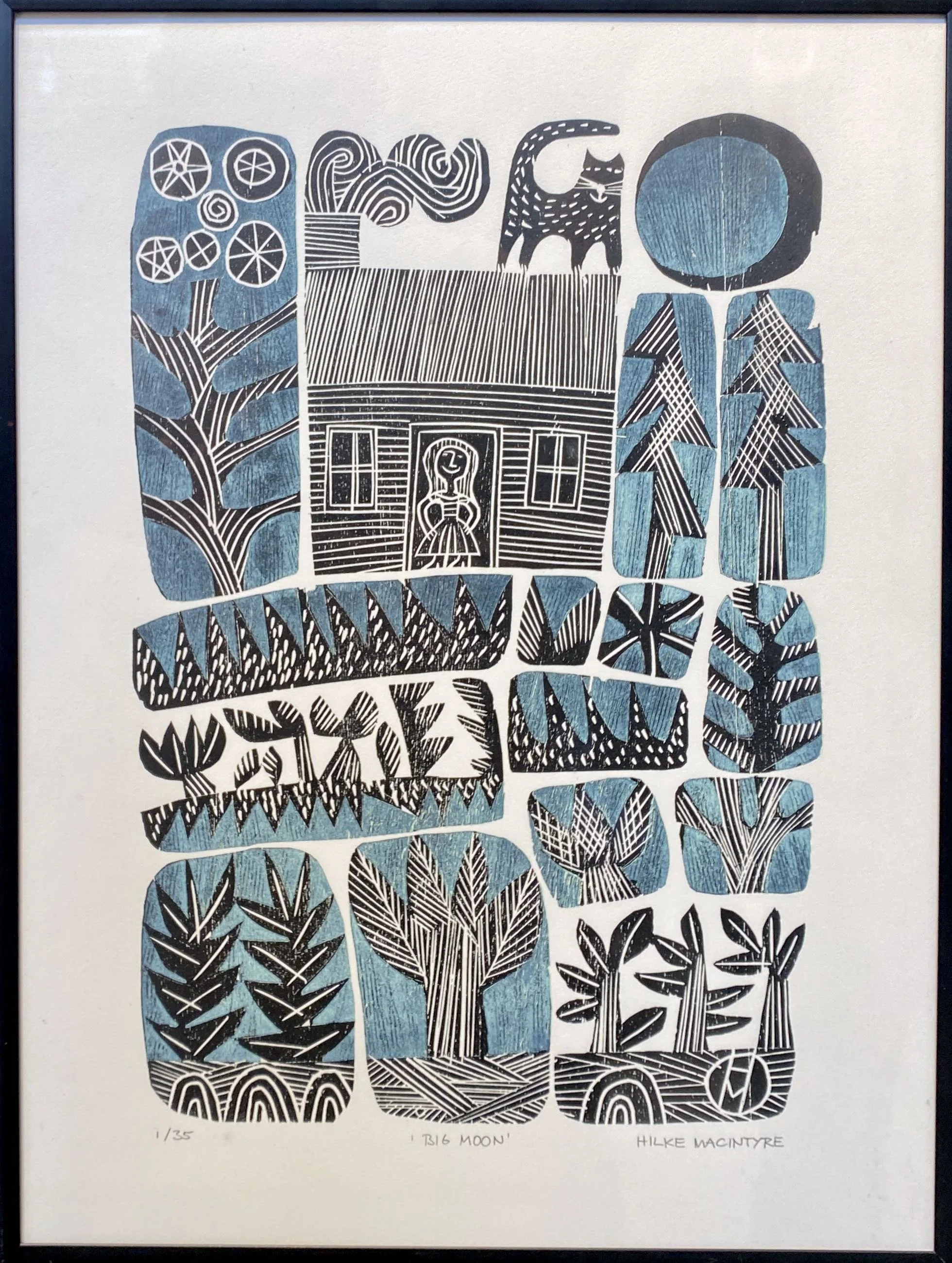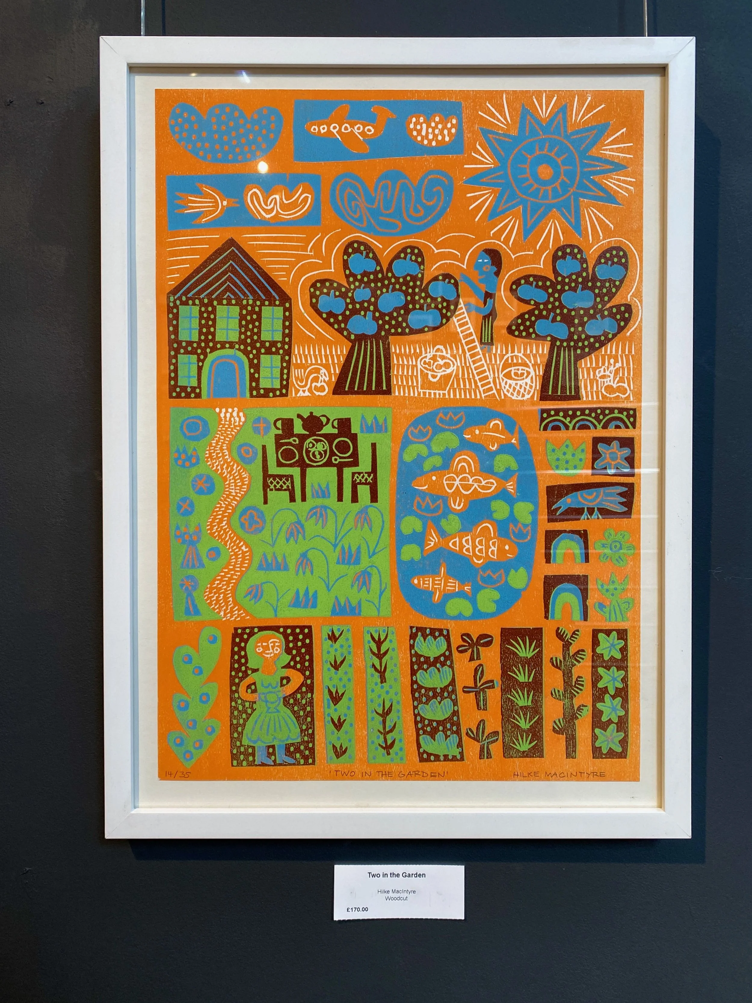 Hilke MacIntyre is a German-born artist who now lives in Scotland. She originally studied architecture in Germany but moved to Scotland in 1995 and has been focusing on her art ever since. Her work is vibrant and often features simplified figures, bold shapes, and striking colours. She’s known for her linocuts, woodcuts, and ceramics, which often depict scenes from everyday life, nature, and animals.