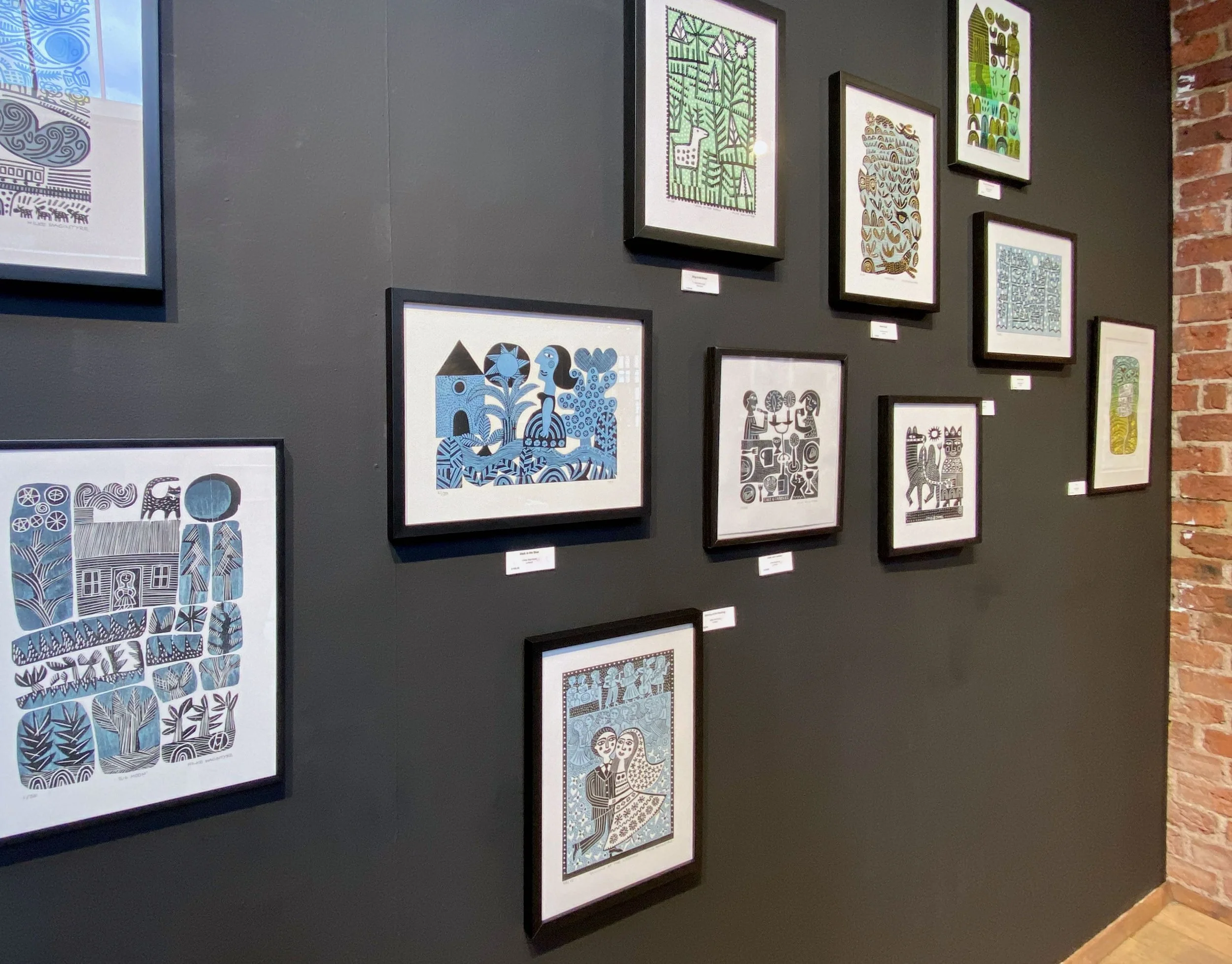 Hilke’s work has a unique style influenced by primitive art and early 20th-century European movements. She enjoys working with linocuts and woodcuts because they’re hands-on and straightforward, allowing her to create playful, spontaneous designs.