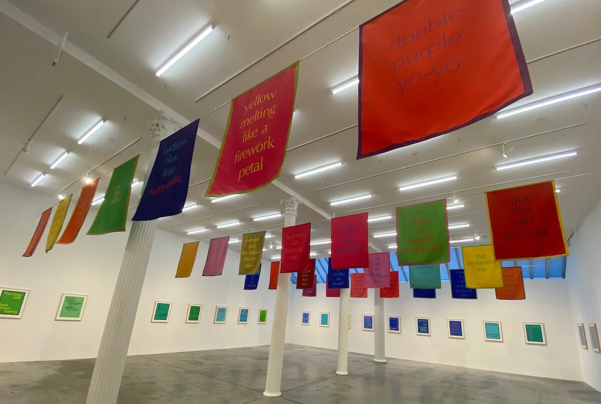 Space Poem #7 (Color Without Objects: Intra-Active May-Words) consists of 28 brightly coloured banners that are hanging just above our heads, lightly swaying in the air. The words on the banners are taken from poems by May Swenson, which now take on a different meaning when combined with Green’s colours.