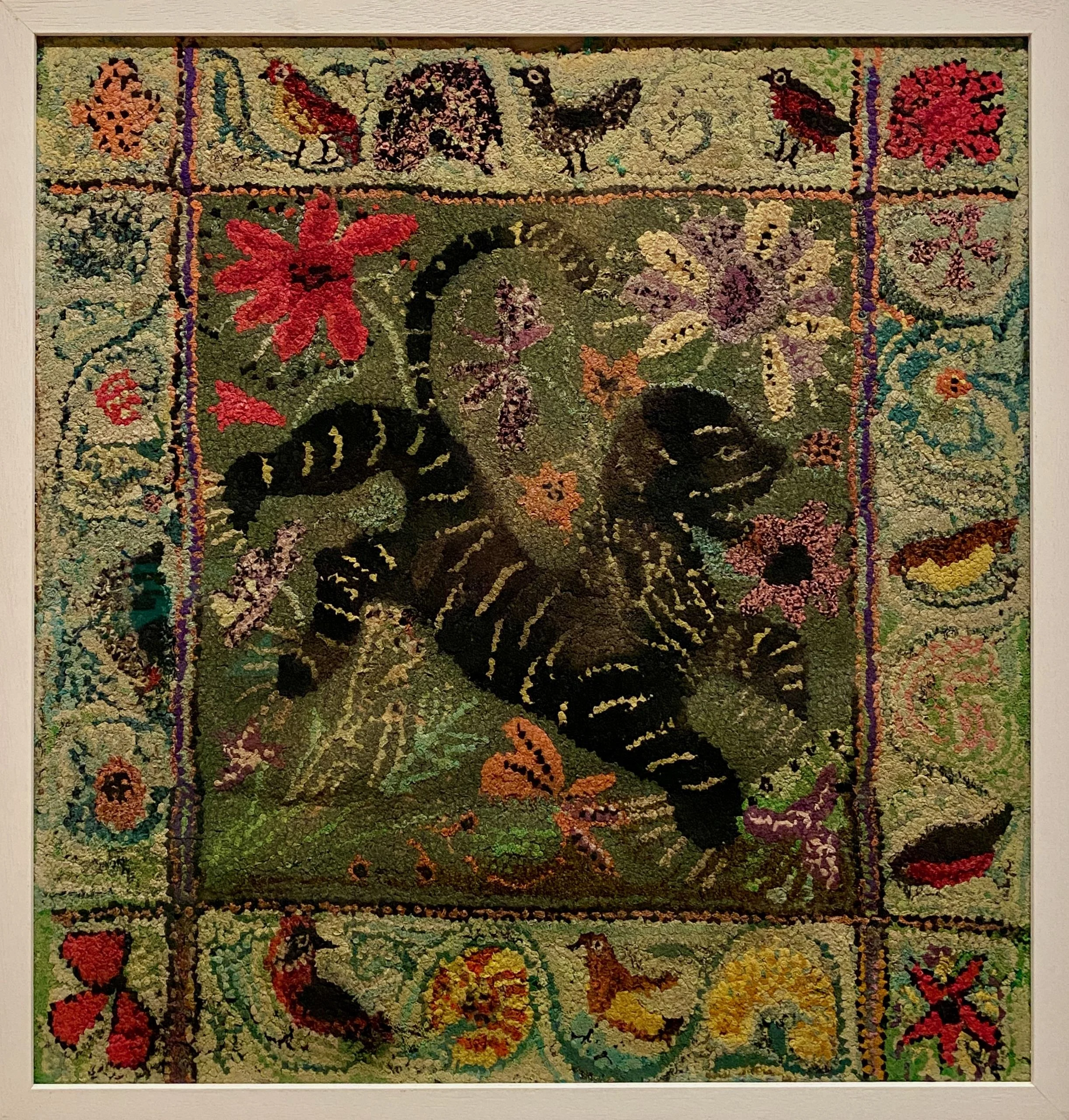 This was an immediate favourite. The detail is wonderful, from the suggestion of flames rising from the fire to the expressive faces of the cats, full of personality. Even rendered in textile, the precision and character are remarkable. Mary Bewick was a key figure in reviving rag rug making in Cumbria during the 1960s, often working from her observations of animals and rural life. Her rugs are finely made, with dense, small loops of fabric that create rich textures and clear forms.